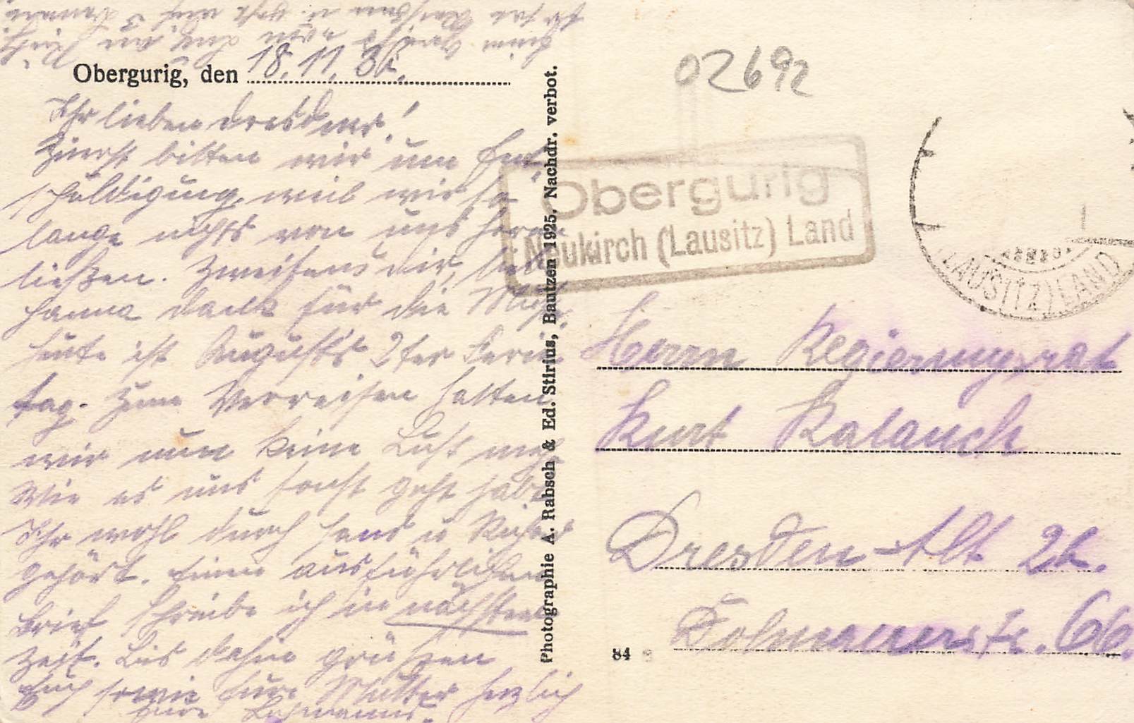 02692 Obergurig Oberlausitz Landpoststempel Obergurig Neukirch (Lausitz) Land o 1930