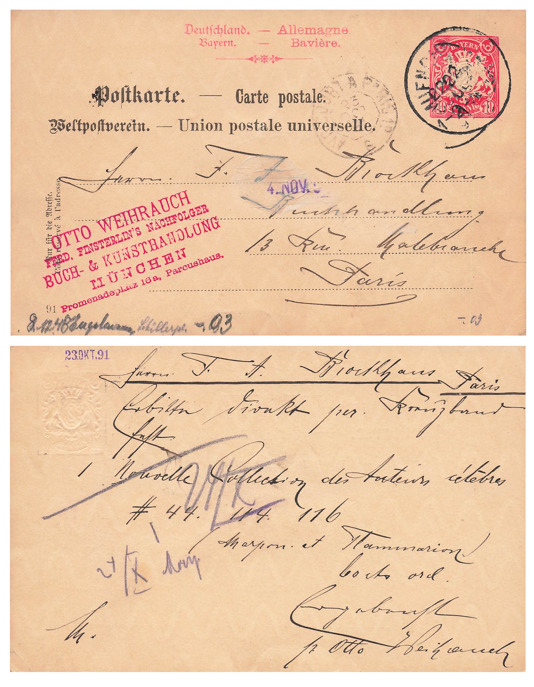 Bayern Wappen 10 Pfennig Ganzsache Wasserzeichen Wellen waagerecht o München 22.7.1891 nach Paris