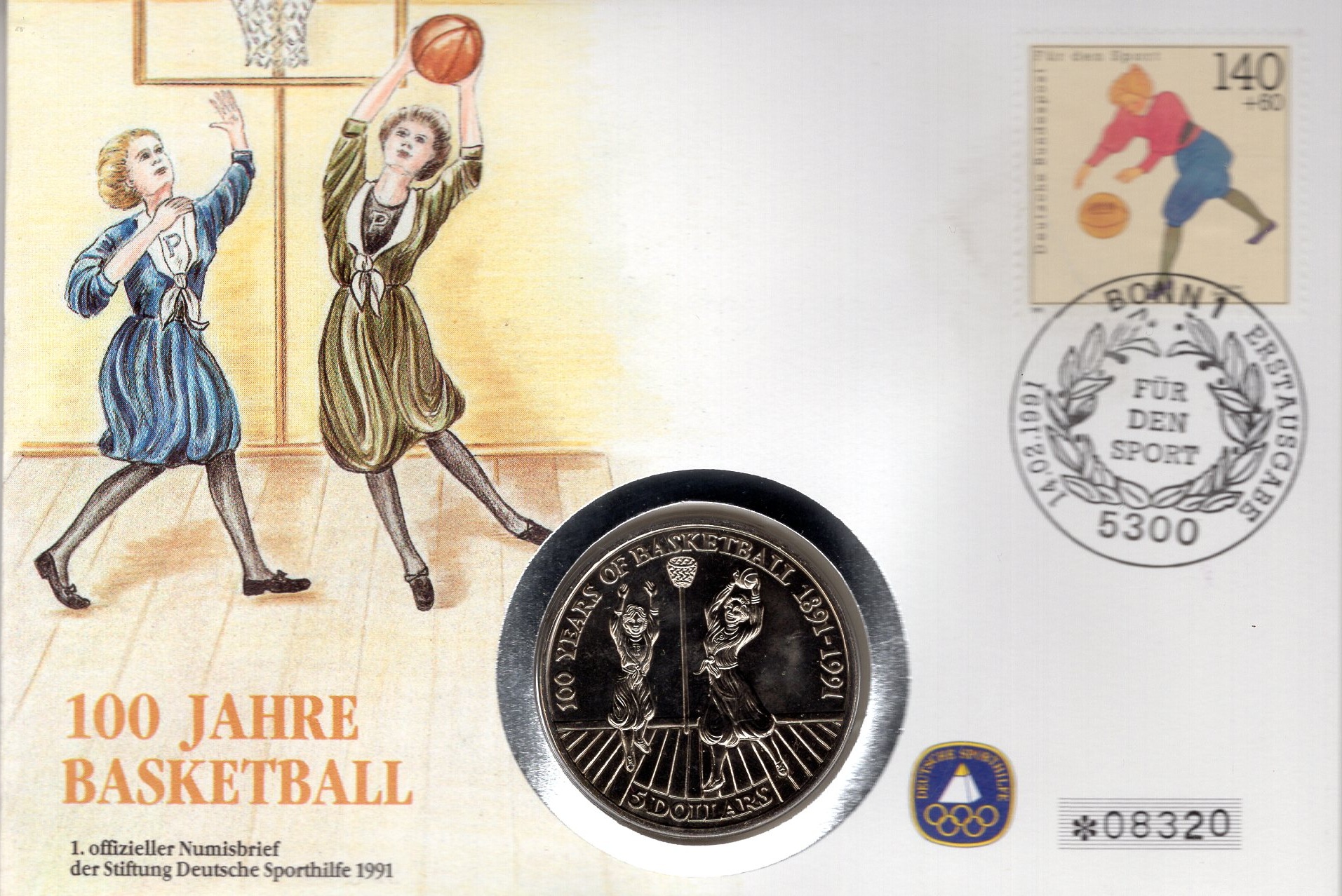 BRD Numisbrief Basketball mit 5 Dollar Niu Münze 1991