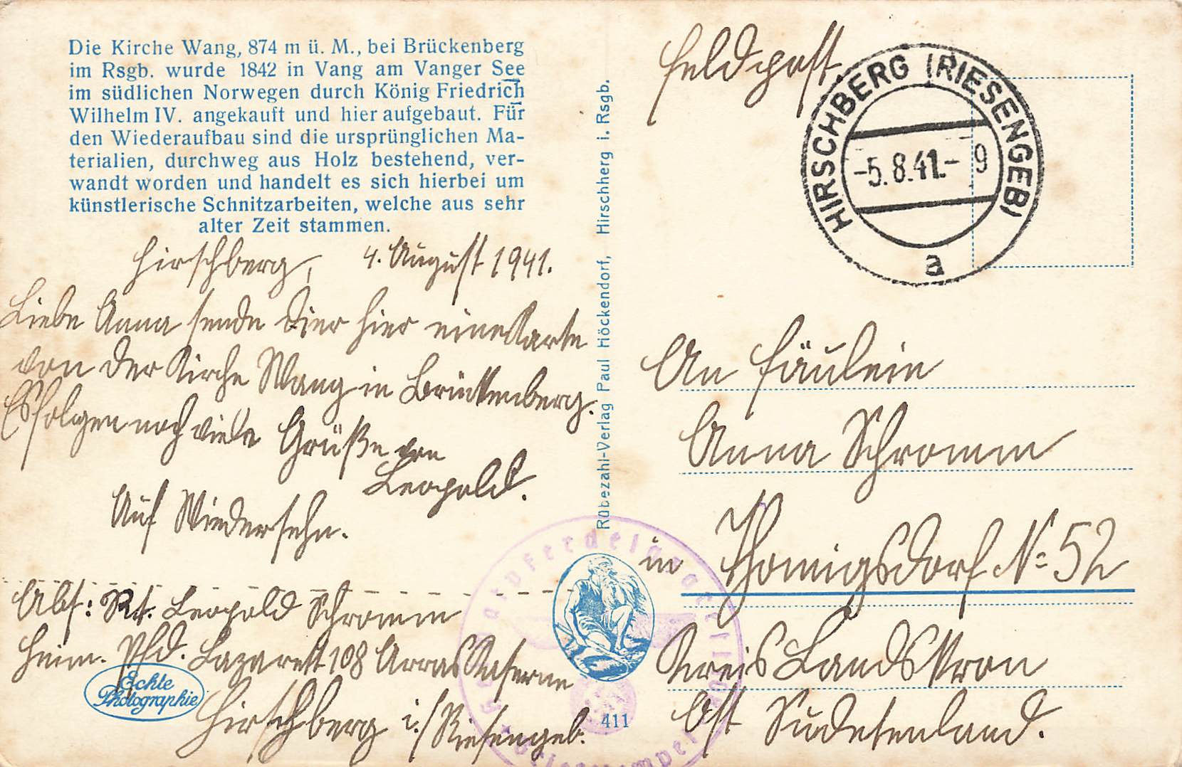 Brückenberg Riesengebirge Kirche Wang Schlesien Bierutowice Feldpost Heimatpferdelazarett Hirschberg 1941