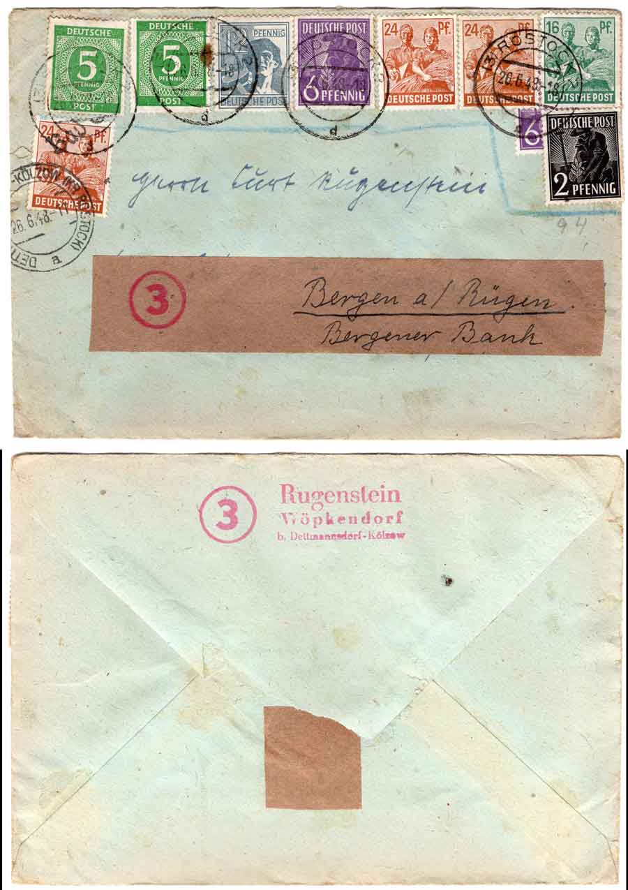 Gemeinschaftsausgaben Zehnfachfrankatur auf Brief von Wöpkendorf bei Dettmannsdorf 26.6.1948 nach Bergen Rügen