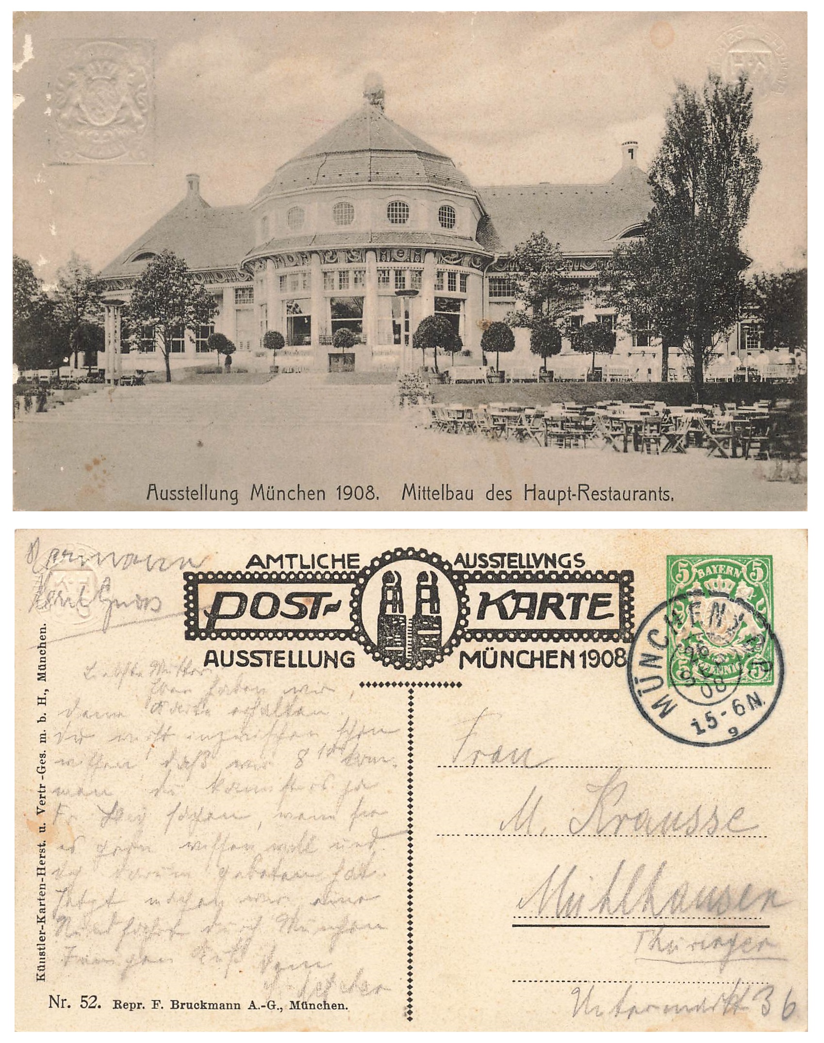 München Ausstellung 1908 Mittelbau des Hauptrestaurants Privatganzsache o 26.9.1908