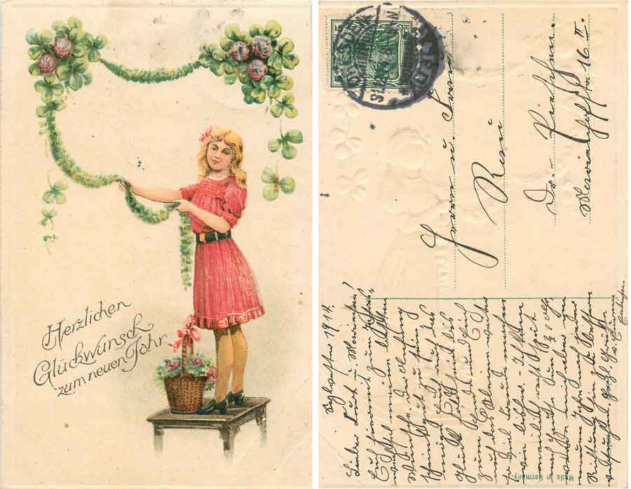 Neujahr Mädchen mit Blumengirlande Prägekarte o 31.12.1914