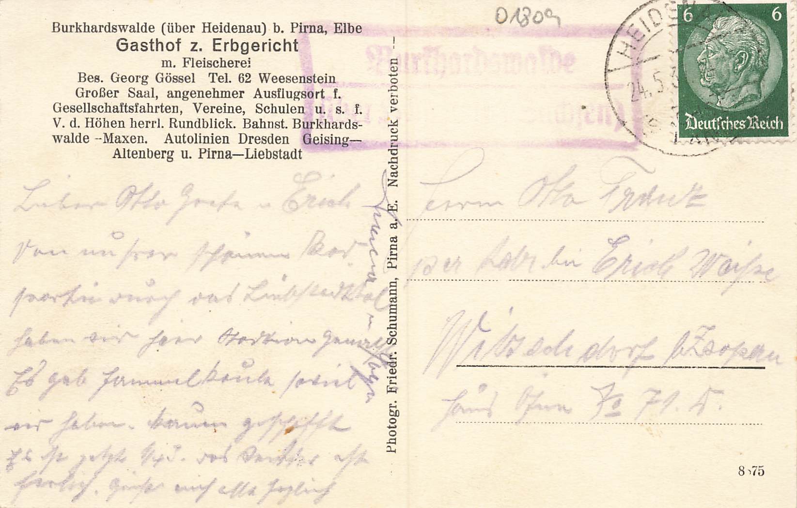 01809 Burkhardswalde Mueglitztal Gasthof Erbgericht Landpoststempel o 1937
