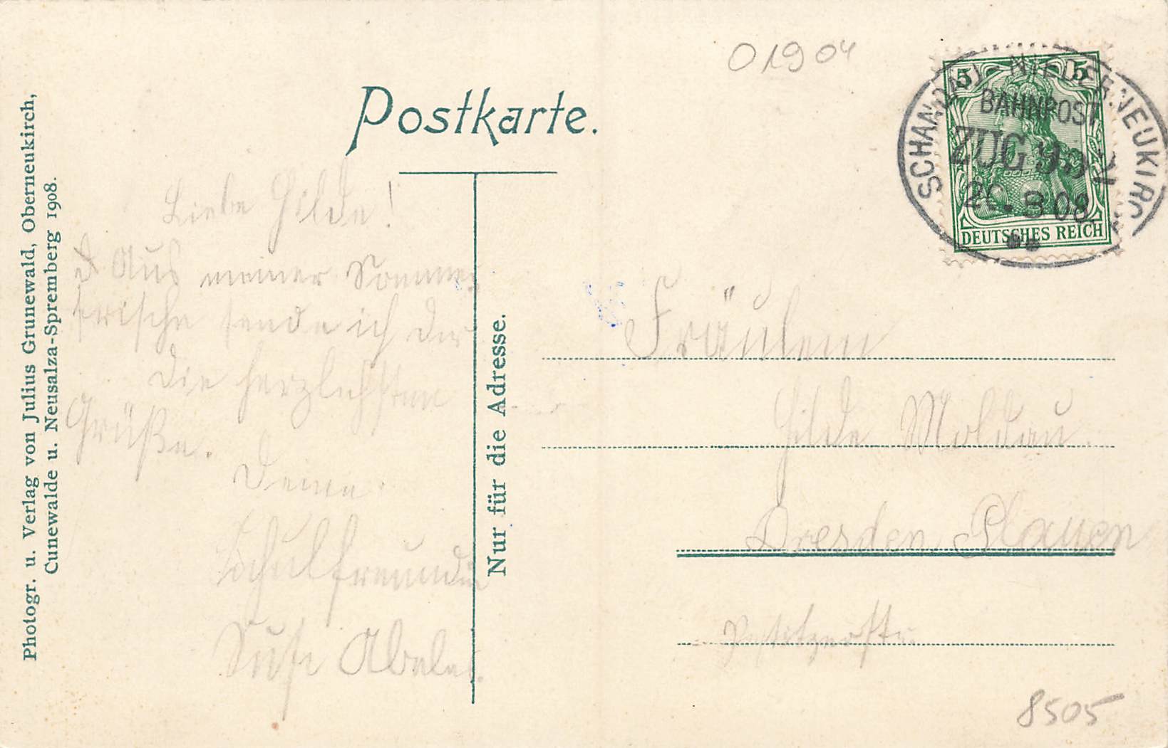01904 Niederneukirch Lausitz Villa Martha Birkenruhe, Goldelse Art Nouveau postcard Railway post Schandau-Niederneukirch Train 992 1908