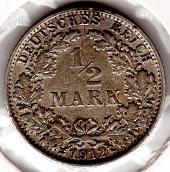 1/2 Mark 1912 E German Empire Silver Coin