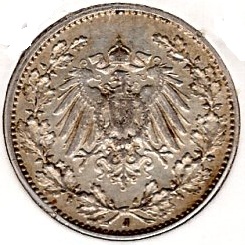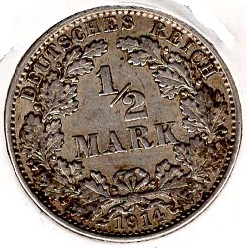 1/2 Mark 1914 J German Empire Silver Coin Catalog Number: Jaeger 16 Material: Silver Weight: 2.72 g Fineness: 900 ‰ (fine weight: 2.45 g) Diameter: 20.00 mm