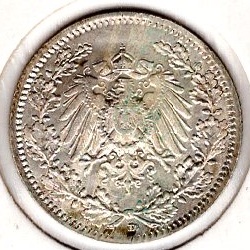 1/2 Mark 1918 D German Empire Silver Coin Catalog Number: Jaeger 16 Material: Silver Weight: 2.72 g Fineness: 900 ‰ (fine weight: 2.45 g) Diameter: 20.00 mm