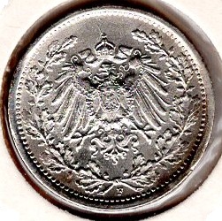 1/2 Mark 1918 F German Empire Silver Coin Catalog Number: Jaeger 16 Material: Silver Weight: 2.72 g Fineness: 900 ‰ (fine weight: 2.45 g) Diameter: 20.00 mm