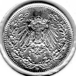 1/2 Mark 1919 D German Empire Silver Coin Catalog Number: Jaeger 16 Material: Silver Weight: 2.72 g Fineness: 900 ‰ (fine weight: 2.45 g) Diameter: 20.00 mm