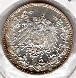 1/2 Mark 1919 E German Empire Silver Coin Catalog Number: Jaeger 16 Material: Silver Weight: 2.72 g Fineness: 900 ‰ (fine weight: 2.45 g) Diameter: 20.00 mm