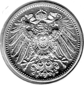 1 Mark 1902 F German Empire Silver Coin Jaeger 17 Large Eagle Material: Silver Weight: 5.55 g Fineness: 900 ‰ (fine weight 5.00 g) Diameter: 24.00 mm