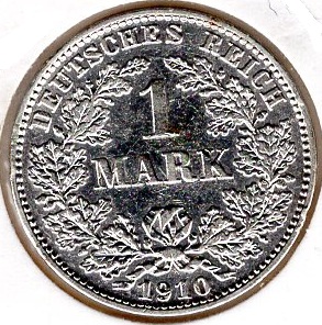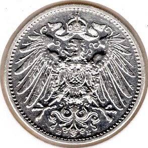 1 Mark 1910 E German Empire Silver Coin Jaeger 17 Large Eagle Material: Silver Weight: 5.55 g Fineness: 900 ‰ (fine weight 5.00 g) Diameter: 24.00 mm