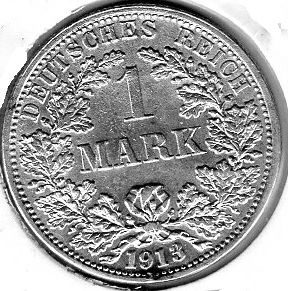 1 Mark 1913 F German Empire Silver Coin Jaeger 17 Large Eagle Material: Silver Weight: 5.55 g Fineness: 900 ‰ (fine weight 5.00 g) Diameter: 24.00 mm