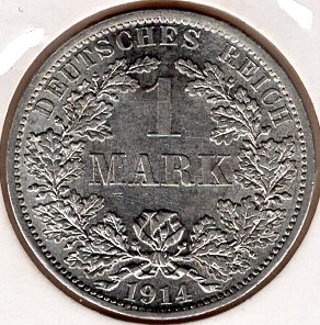 1 Mark 1914 A German Empire Silver Coin Jaeger 17 Large Eagle Material: Silver Weight: 5.55 g Fineness: 900 ‰ (fine weight 5.00 g) Diameter: 24.00 mm