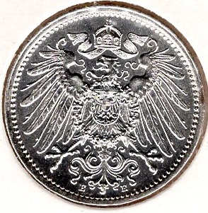 1 Mark 1915 E German Empire Silver Coin Jaeger 17 Large Eagle Material: Silver Weight: 5.55 g Fineness: 900 ‰ (fine weight 5.00 g) Diameter: 24.00 mm