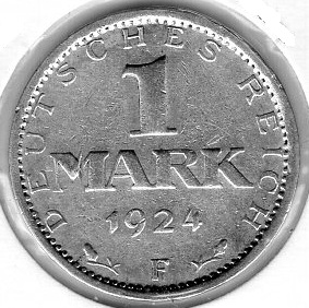 1 Mark 1924 F Weimar Republic silver coin Catalog number: J 311 Material: Silver Weight: 5.00 g Fineness: 500 ‰ (fine weight 2.50 g) Diameter: 22.60 mm