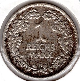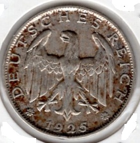 1 Mark 1925 A Weimar Republic Silver Coin Catalog Number: Jaeger 319 Material: Silver Weight: 4.92 g Fineness: 500 ‰ (fine weight: 2.46 g) Diameter: 22.60 mm