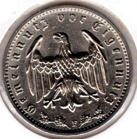 1 Reichsmark 1936 F Third Reich Catalog number: Jaeger 354 Material: Nickel Diameter: 23.00 mm