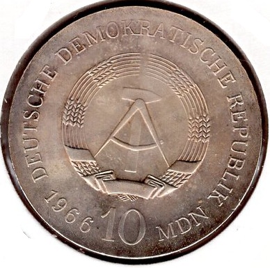 10 Mark GDR 1966 Friedrich Schinkel Catalog number Jaeger 1517 Material: Silver Weight: 17.00 g Fineness: 500‰ (Fine weight 8.50 g) Diameter: 31.00 mm Mintage: 50,000
