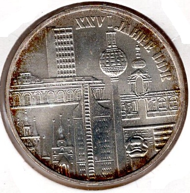 10 Mark GDR 1974 25 Years of the GDR Catalog Number Jaeger 1552 Material: Silver Weight: 17.00 g Fineness: 500‰ (Fine weight 8.50 g) Diameter: 31.00 mm