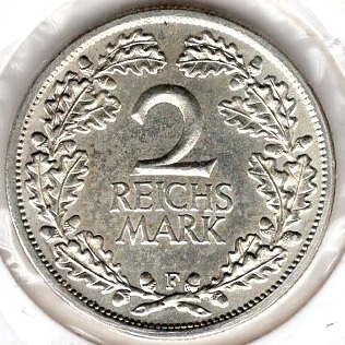2 Mark 1925 F Weimar Republic Silver Coin Catalog Number: J 320 Material: Silver Weight: 10.00 g Fineness: 500 ‰ (fine weight 5.00 g) Diameter: 26.00 mm