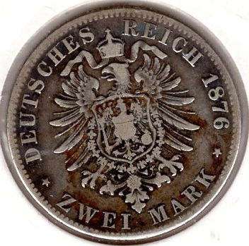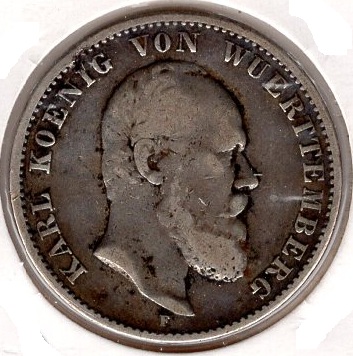 2 Mark Württemberg King Charles Silver Coin Catalog Number: Jäger 172 Material: Silver Weight: 11.11 g Fineness: 900‰ (Fine weight 10.00 g) Diameter: 28.00 mm
