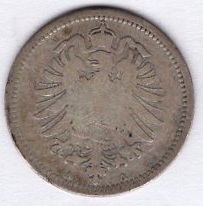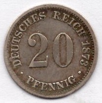 20 Pfennig 1873 F Imperial Silver Coin Catalog Number: Jaeger 5 Material: Silver Weight: 1.11 g Fineness: 900 ‰ (fine weight 1.00 g) Diameter: 16.00 mm