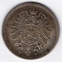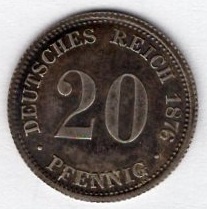 20 Pfennig 1876 B Imperial Silver Coin Catalog Number: Jaeger 5 Material: Silver Weight: 1.11 g Fineness: 900 ‰ (fine weight 1.00 g) Diameter: 16.00 mm