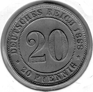 20 Pfennig 1888 E German Empire Catalog Number: Jaeger 6 Material: Copper-Nickel Weight: 6.25 g