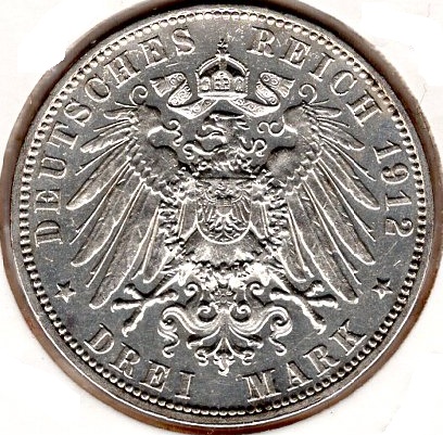 3 Mark Hamburg 1912 Silver Coin Catalog Number: Jaeger 64 Material: Silver Weight: 16.67 g Fineness: 900‰ (Fine weight 15.00 g) Diameter: 33.00 mm