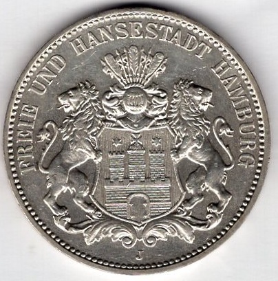 3 Mark Hamburg 1914 Silver Coin Catalog Number: Jaeger 64 Material: Silver Weight: 16.67 g Fineness: 900‰ (Fine weight 15.00 g) Diameter: 33.00 mm