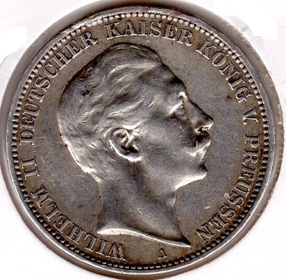 3 Mark Prussia 1910 Wilhelm II Silver Coin Catalog Number: Jaeger 103 Material: Silver Weight: 16.67 g Fineness: 900‰ (Fine weight 15.00 g) Diameter: 33.00 mm