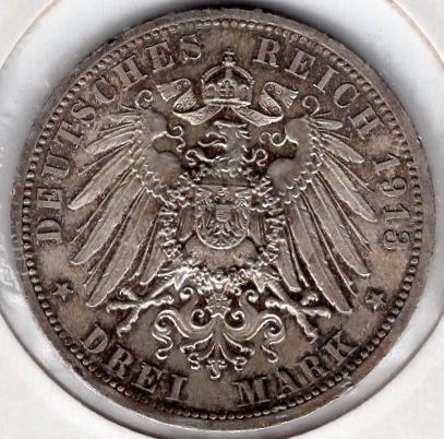 3 Mark Prussia 1913 Kaiser Wilhelm II 25th Anniversary Silver Coin Catalog Number: Jäger 112 Material: Silver Weight: 16.66 g Fineness: 900‰ (Fine weight 14.99 g) Diameter: 33.00 mm