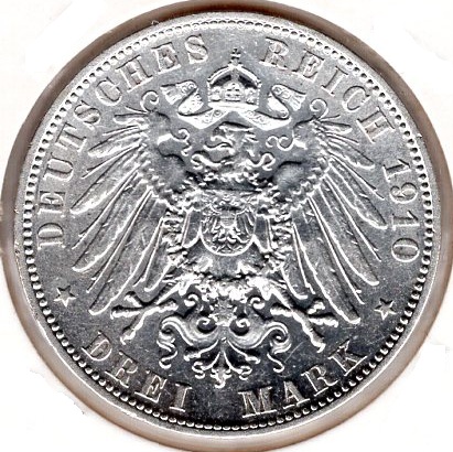 3 Mark Saxony 1910 Friedrich August silver coin Catalog number: Jäger 135 Material: Silver Weight: 16.67 g Fineness: 900‰ (fine weight 15.00 g) Diameter: 33.00 mm