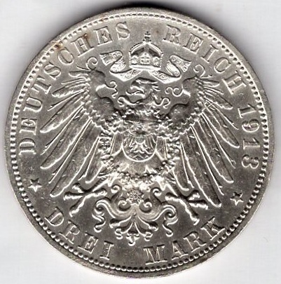 3 Mark Saxony 1913 Friedrich August silver coin Catalog number: Jaeger 135 Material: Silver Weight: 16.67 g Fineness: 900‰ (fine weight 15.00 g) Diameter: 33.00 mm