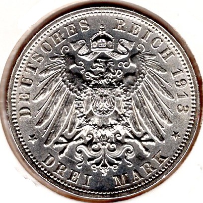 3 Mark Saxony 1913 Monument to the Battle of the Nations Catalog number: Jäger 140 Material: Silver Weight: 16.67 g Fineness: 900‰ (fine weight 15.00 g) Diameter: 33.00 mm