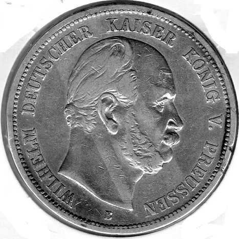 5 Mark Prussia 1876 B Wilhelm I. Silver Coin Catalog Number: Jäger 97 Material: Silver Weight: 27.78 g Fineness: 900‰ (Fine weight 25.00 g) Diameter: 38.00 mm