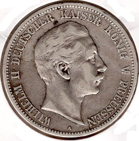 5 Mark Prussia 1894 Wilhelm II Silver Coin Catalog Number: Jäger 104 Material: Silver Weight: 27.85 g Fineness: 900‰ (Fine weight 25.07 g) Diameter: 38.00 mm