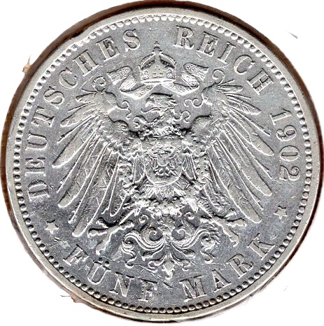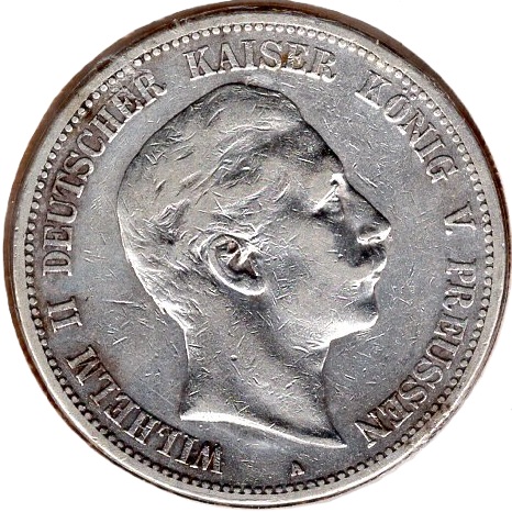 5 Mark Prussia 1902 Wilhelm II Silver Coin Catalog Number: Jäger 104 Material: Silver Weight: 27.70 g Fineness: 900‰ (Fine weight 24.93 g) Diameter: 38.00 mm