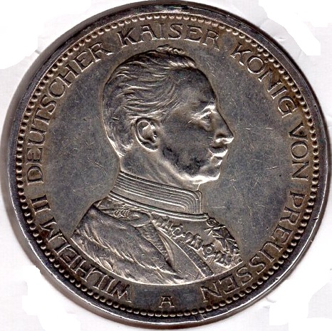 5 Mark Prussia 1914 Bust in Uniform Silver Coin Catalog Number: Jäger 114 Material: Silver Weight: 27.85 g Fineness: 900‰ (Fine weight 25.07 g) Diameter: 38.00 mm