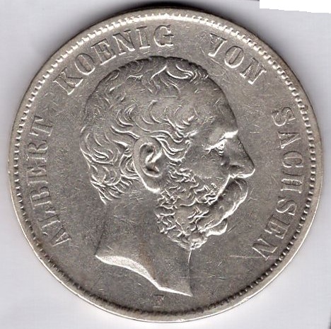 5 Mark Saxony 1876 King Albert Silver Coin Catalog Number: Jäger 122 Material: Silver Weight: 27.78 g Fineness: 900‰ (Fine weight 25.00 g) Diameter: 38.00 mm