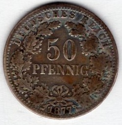 50 Pfennig 1877 C German Empire Silver Coin Catalog Number: Jaeger 8 Material: Silver Weight: 2.78 g Fineness: 900 ‰ (fine weight 2.50 g) Diameter: 20.00 mm