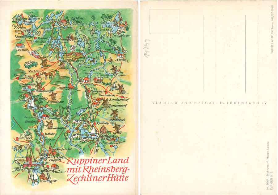 Alfred Hoppe Ruppiner Land with Rheinsberg-Zechliner Hütte map postcard 1968