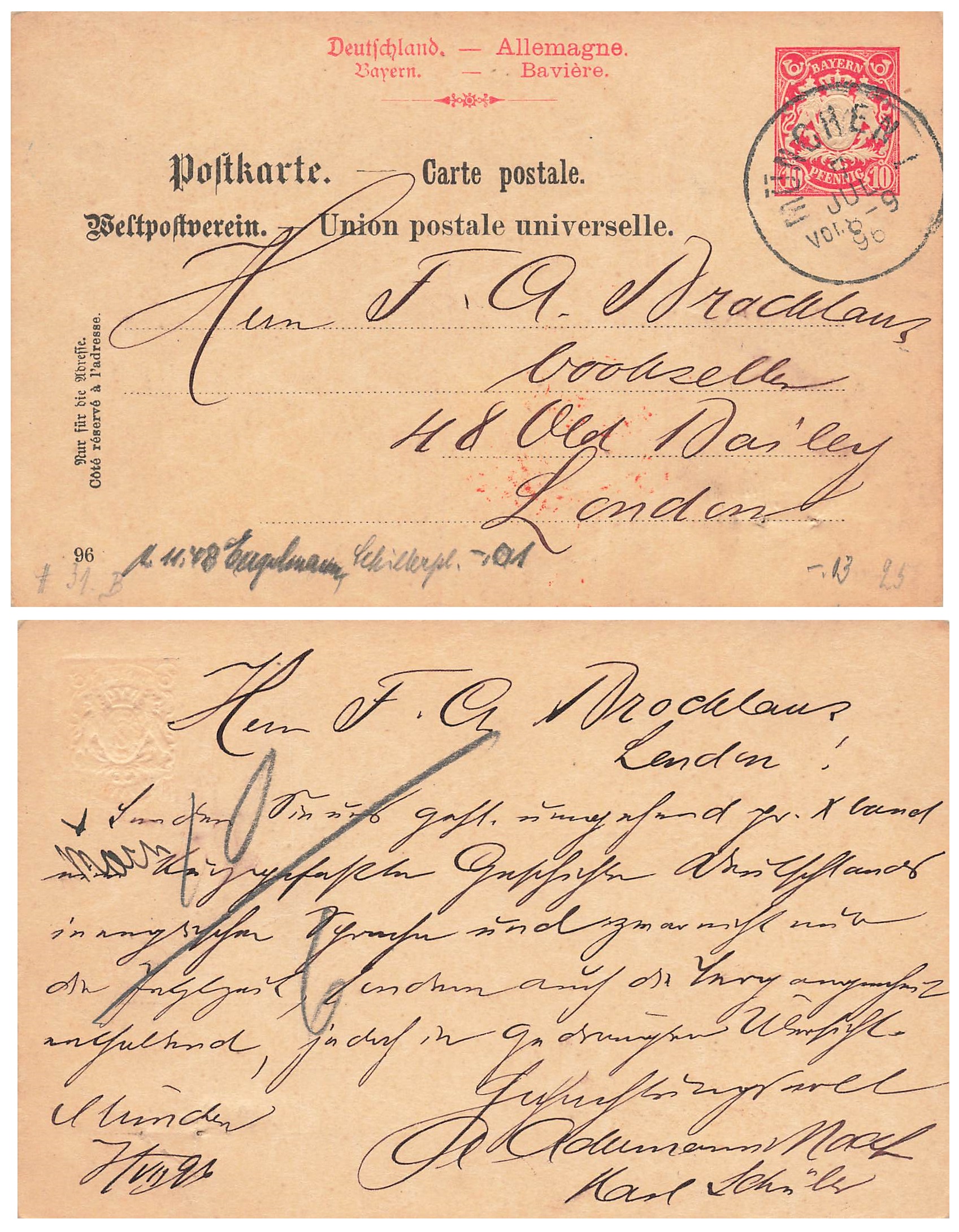 Bavaria coat of arms 10 Pfennig postal stationery watermark waves vertical o Munich 7.7.1896 to London