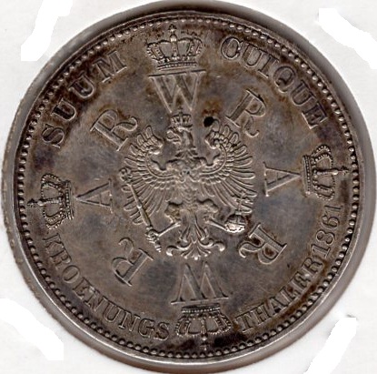 Brandenburg-Prussia 1861 Coronation Thaler King Wilhelm and Queen Augusta Catalog number: Jäger 87 Material: Silver Weight: 18.52 g Fineness: 900‰ (fine weight 16.67 g) Diameter: 33.00 mm