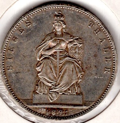 Brandenburg-Prussia 1871 Victory Thaler A Wilhelm I Catalog number: Jaeger 99 Material: Silver Weight: 18.52 g Fineness: 900‰ (fine weight 16.67 g) Diameter: 33.00 mm