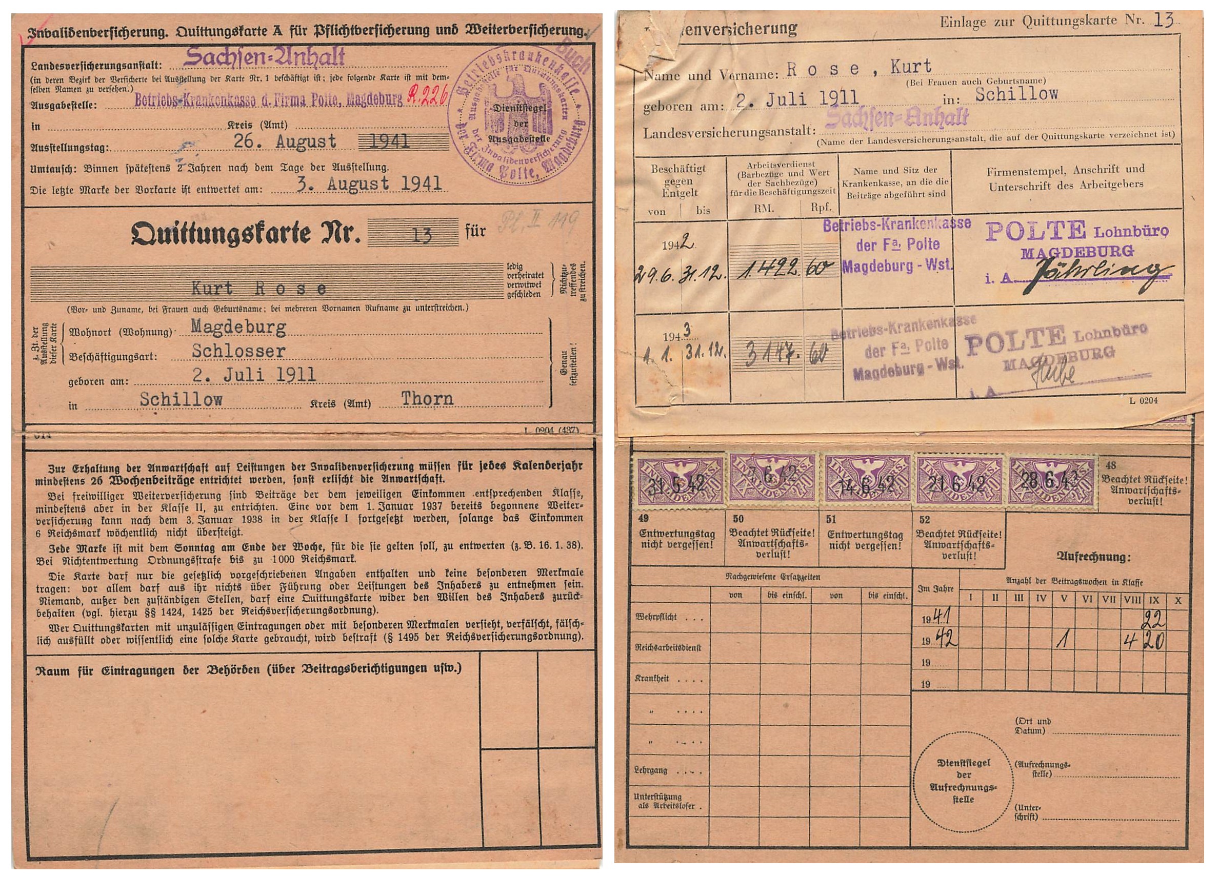 Disability insurance Saxony Anhalt receipt card company Polte Magdeburg 1941