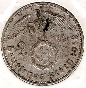 Jager 0366 2 Reichsmark 1938 G Hindenburg Silver Coin German Empire Silver 0.625 Weight 8g (5g fine) Diameter 25mm