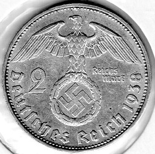 Jager 0366 2 Reichsmark 1938 J Hindenburg Silver Coin German Empire Silver 0.625 Weight 8g (5g fine) Diameter 25mm